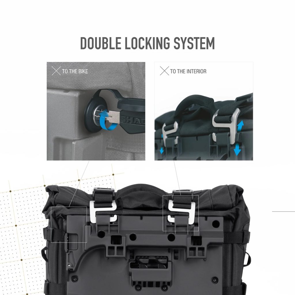 Patentovaný Double Locking System umožňuje uzamknout brašnu k montážní sadě SHAD 4P System a zároveň chrání obsah před neoprávněným přístupem – vše pomocí jednoho klíče. Zámek je chráněn proti prachu a vybaven nejnovější prémiovou vložkou SHAD.