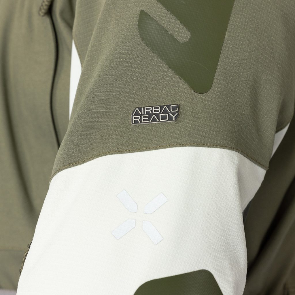 Bezpečnost zajišťují certifikované chrániče zad, ramen a loktů s nastavitelnou výškou (plus volitelné chrániče hrudi).