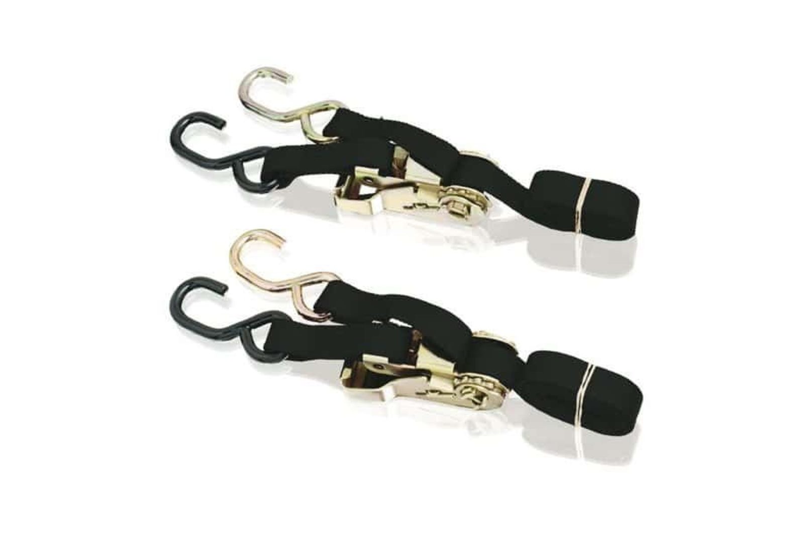 Černé univerzální popruhy pro upevnění motorky při její přepravě. Popruhy byly vyrobeny z kvalitního materiálu, který odolá vysokému napětí a setrvačnosti, která při přepravě motocyklu vzniká. Na konci popruhů jsou háčky, pro snadné uchycení na potřebné místo při přepravě.