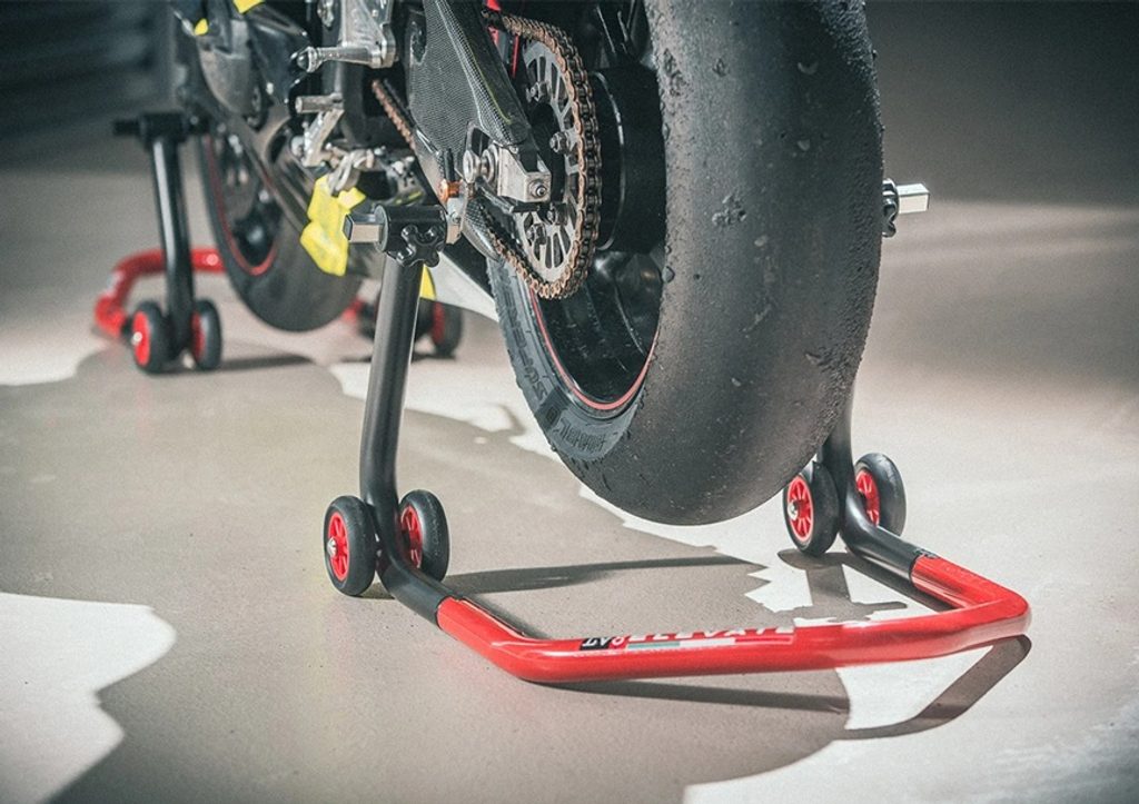 Patentovaný zadní stojan na motorku dodávaný ve třech snadno montovatelných dílech - lze ho sestavit bez použití šroubů a šroubováků.