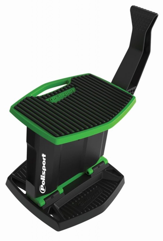Polisport Zvedací stojan je první hybridní stojan (vyrobený z plastu a kovu), který je zároveň zvedací a skládací. Pomocí zvedací páky zvednete motocykl s minimálním úsilím. Má pevnou a odolnou strukturu, která je zesílená kovovým rámem. Díky tomu má stojan nosnost až 200 kg. Vrchní část je vyrobena z gumového kompozitu, který zajišťuje stabilitu motocyklu. Úložné přihrádky se hodí na odložení nářadí při údržbě motocyklu